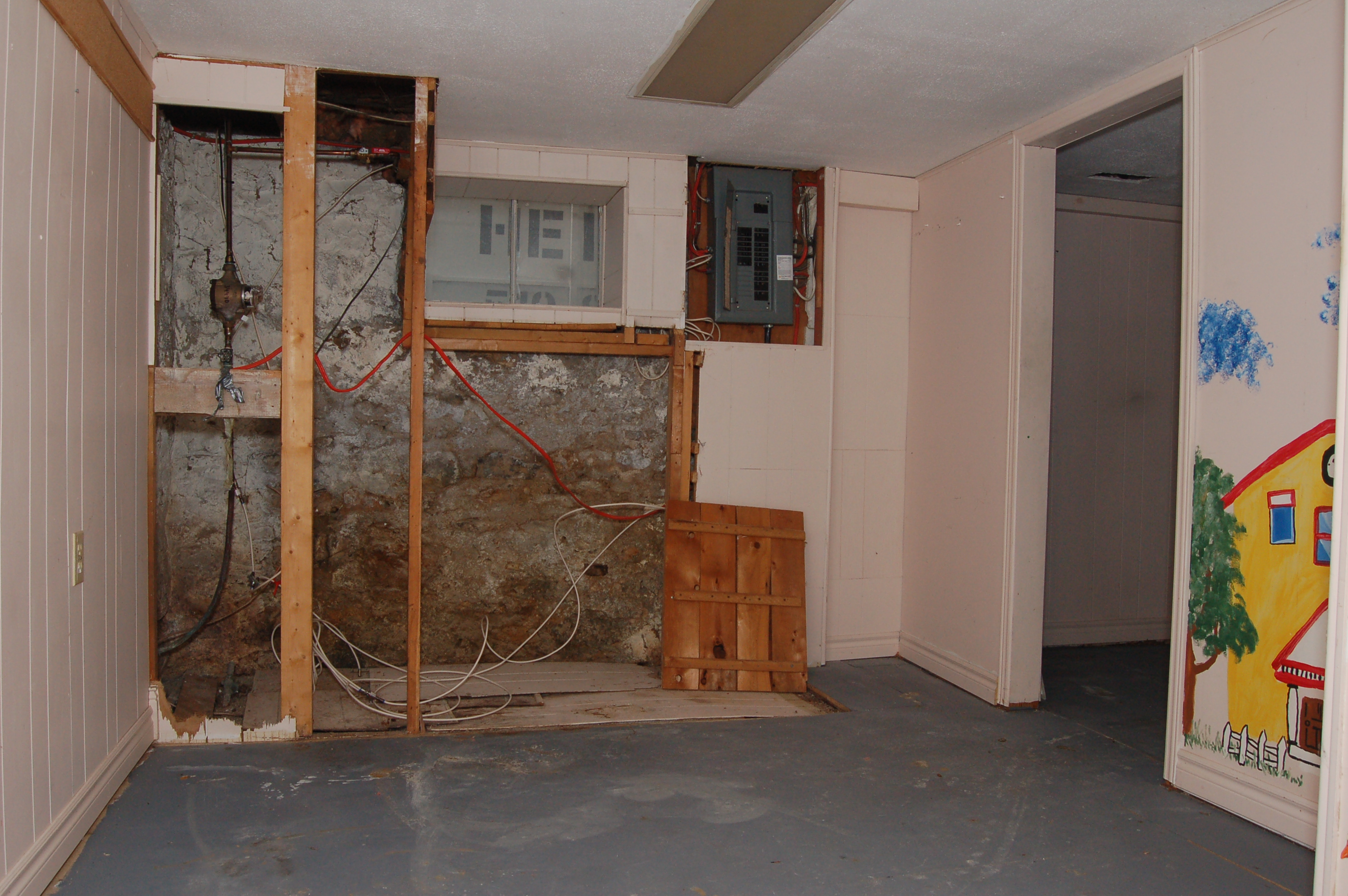 The basement in our home is rubble walled with a concrete floor. Previous owners a couple of decades ago partially finished the basement. I’m using the word “finished’ quite loosely here. We’re talking pressboard floors (on concrete), various wall treatments – some panel, some sheetrock, some materials unknown. There were odd cut-outs and lots of soft spots in the floor.