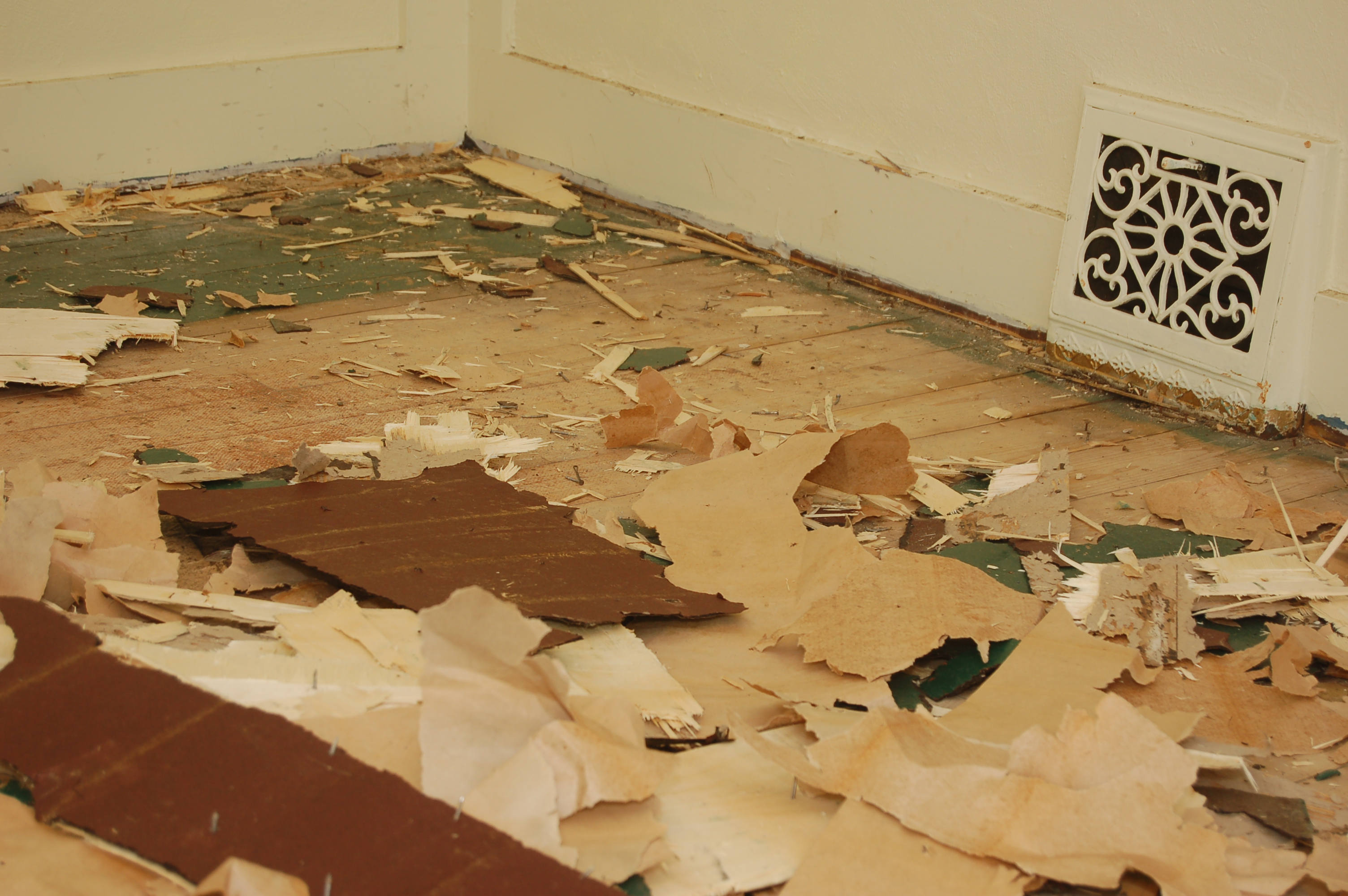 Each was also very dirty, in some cases moldy and not well installed. The hallway and staircase also had each a different carpet and those came up as well. In some rooms I went from being able to touch the ceiling to not being able to – that’s how many layers of flooring there was.